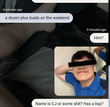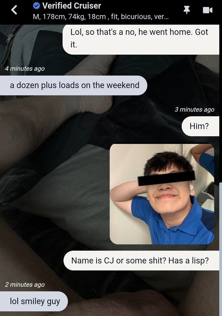 "I usually block him. He's so persistent, though. He was on here with a blank profile like... last week asking to get fucked raw". (exactly 3 days following the quote to the left)